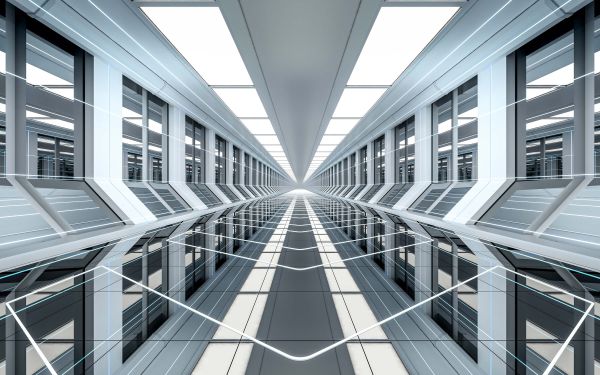 Een futuristische 3D gang in een kantoor gebouw.