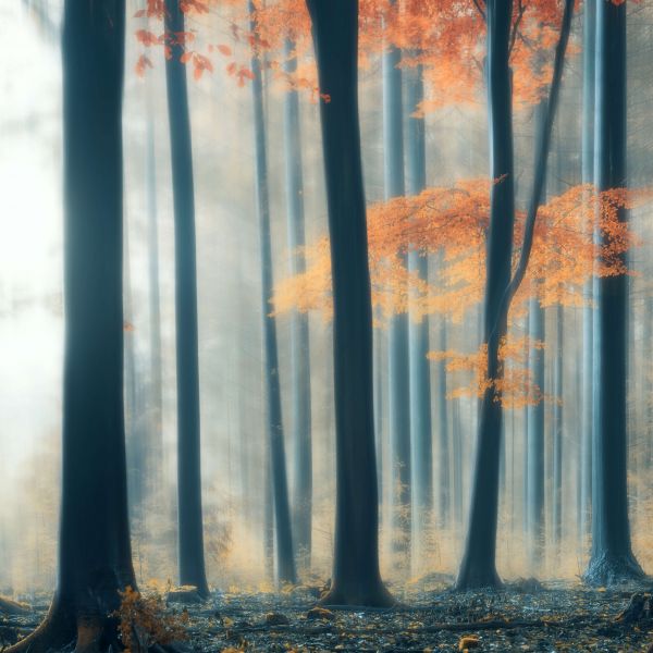 Een bos tijdens de herfst. Aan een van de bomen zit nog een tak met mooi gekleurde herfstbladeren.