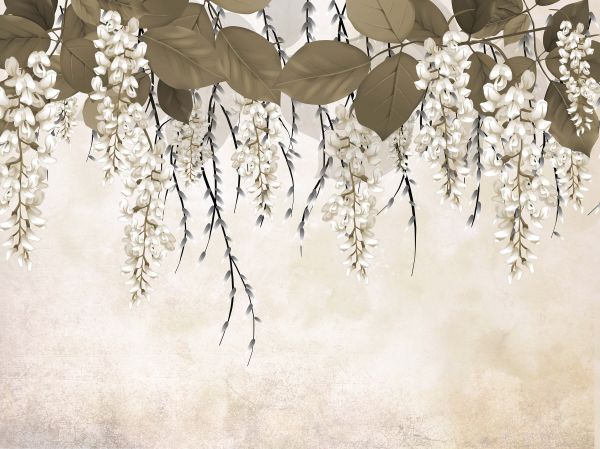 Acacia bloemen met een beige achtergrond. Met dit fotobehang in de kamer is het net alsof je een bloemenhaag in de kamer hebt.