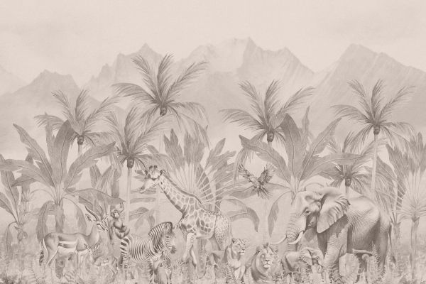 Dwaal af naar een sereen landschap waar de essentie van de Afrikaanse savanne tot leven komt. De fijn uitgebeelde dieren, van de nobele olifant tot de statige giraffe, staan afgebeeld tegen een decor van subtiele palmbladeren en bergsilhouetten, allen in harmonieuze grijstinten.
