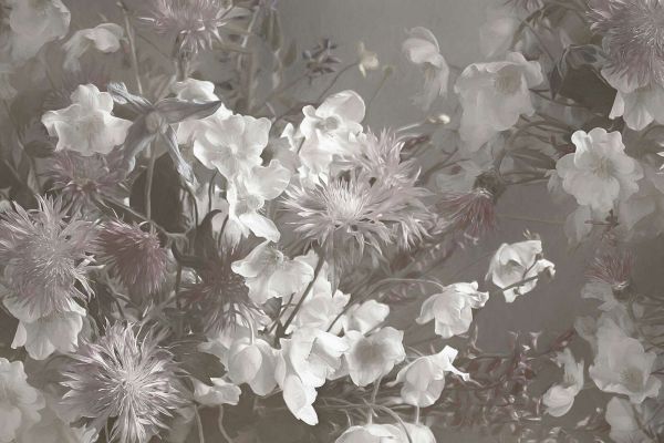 Dit verfijnde ontwerp straalt een tijdloze elegantie uit met een palet van zachte, vergrijsde tinten en subtiele pastels. De witte bloemen, gecombineerd met lichtroze distels en grijsgroene bladeren, vormen een harmonieus geheel dat doet denken aan een klassiek bloemstilleven. De zachte vervaging en schilderachtige details geven een romantische, bijna impressionistische uitstraling, waardoor dit ontwerp perfect past in een interieur met een serene en elegante sfeer.