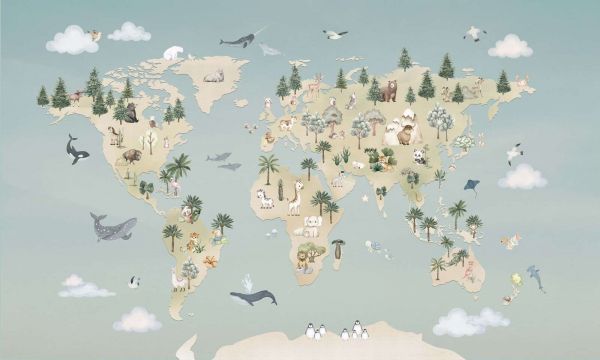 Een zachte wereldkaart in pastelkleuren met verspreid over de continenten allerlei dieren zoals giraffen, beren, panda’s en walvissen. Subtiele bomen, wolkjes en oceaandieren zorgen voor een speels en leerzaam geheel met een rustige, natuurlijke uitstraling.