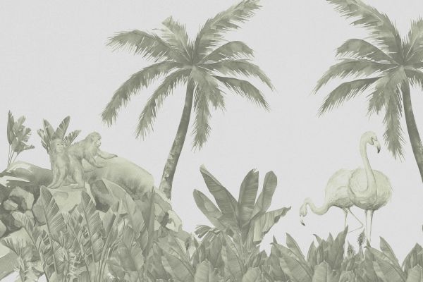 Fotobehang - Apen en flamingo's in groen