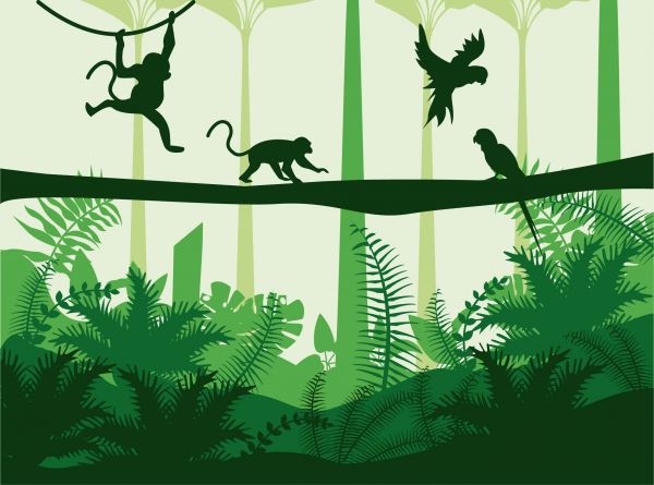 Een groene illustratie met apen die aan het apenkooien zijn.