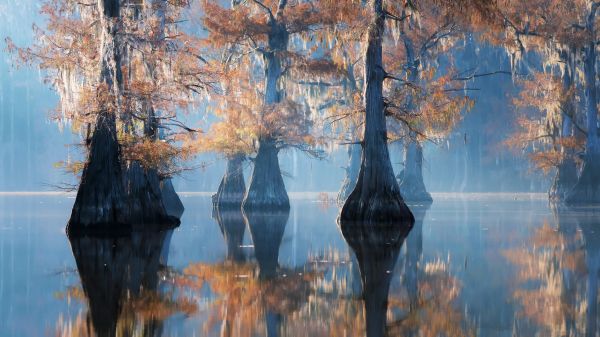 Fotobehang van een meer met bomen. Tussen de bomen door hangt er lichte mist boven het water wat deze foto mysterieus maakt.