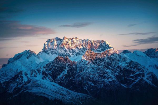 Een monumentaal gebergte gevangen in het laatste zonlicht, met glinsterende sneeuw, diepe schaduwen en een warme avondgloed over de imposante pieken.