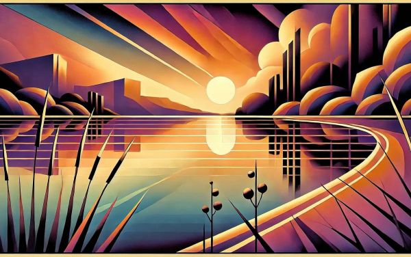 Een zonsondergang weerspiegelt op een stil meer, omlijst door gestileerde planten, glooiende vormen en strakke lijnen. Warme tinten oranje, paars en goud creëren een dromerige sfeer vol diepte en contrast.