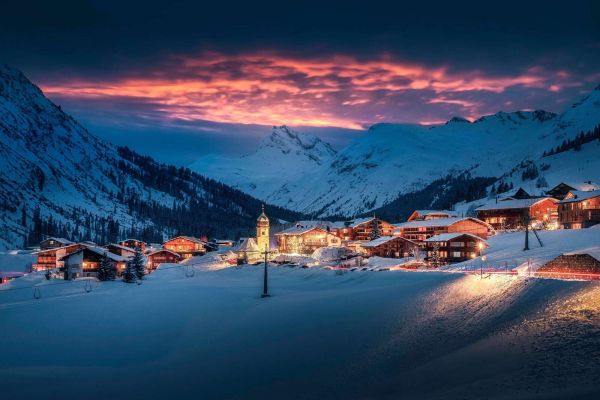 Een sfeervol bergdorp gehuld in winterse stilte, verlicht door warme lichtjes en een betoverende roze gloed in de avondlucht. De besneeuwde chalets en bergtoppen vormen samen een schilderachtig winters tafereel.