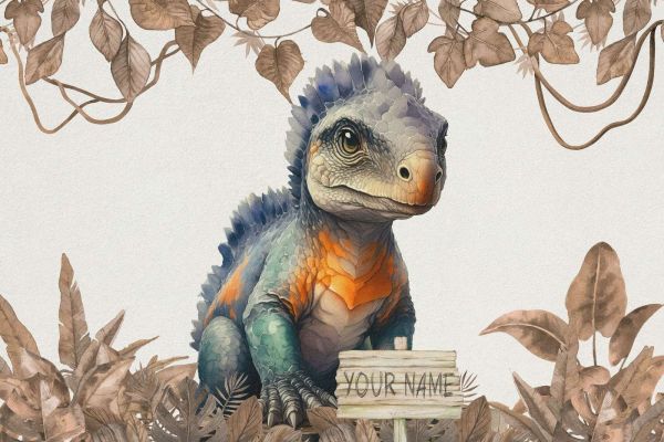 Een baby ankylosaurus in een taupe kleurige jungle. Ook verkrijgbaar met naam van je kind!