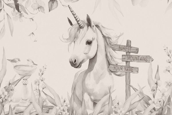 In een betoverde tuin vol bloeiende bloemen en fladderende vogels, staat een sierlijke eenhoorn als bewaker van de natuurlijke schoonheid. De dromerige blik en de zachtheid van de omgeving worden gevangen in een zacht palet van grijstinten, dat een mystieke sfeer oproept.