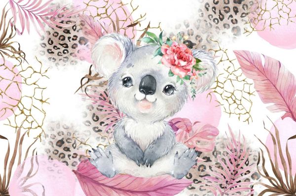 Prachtig behangpapier met een kleine vrouwelijke koala in een bruin en roze savanne decor.