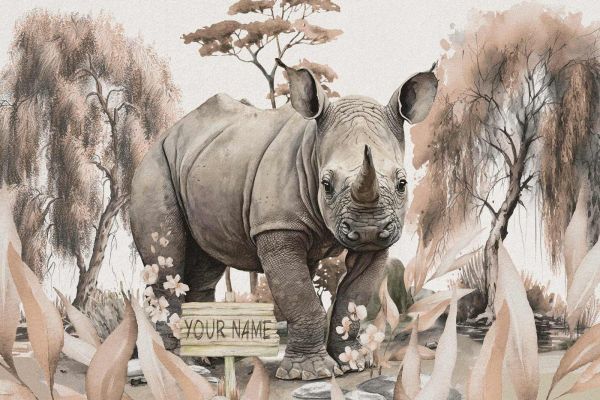 Een baby neushoorn op de taupe gekleurde savanne. Nu ook te personaliseren met de naam van uw kind!