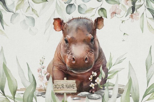 Een schattige baby nijlpaard tussen de bladeren. Ook verkrijgbaar met de naam van uw kind!