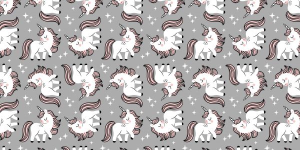 Een patroon van witte baby unicorns met roze manen op een grijze achtergrond.