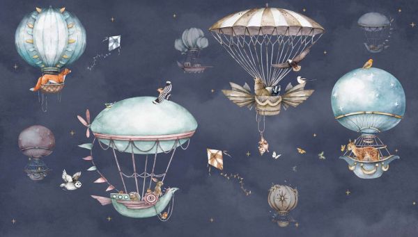 In dit betoverende nachtlandschap zweven bosdieren door een sterrenhemel in sierlijke luchtballonnen. Elk dier – van vos tot konijn en vogel – heeft zijn eigen unieke ballon, variërend van klassieke vormen tot fantasierijke ontwerpen zoals een vliegende uil of een schipvormige mand. Vliegers dansen speels tussen de ballonnen, terwijl witte duiven en uilen door de lucht glijden. De achtergrond bestaat uit een diepblauwe lucht met subtiele wolkstructuren en fonkelende sterren, wat het geheel een dromerige en rustgevende uitstraling geeft.
