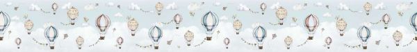 Deze dromerige illustratie toont een hemel vol sierlijke luchtballonnen in tinten van lichtblauw, beige, oudroze en zachtgrijs. De lucht is helder en lichtblauw, gevuld met pluizige witte wolken, kleurrijke slingers en speels zwevende vlaggetjes. De ballonnen verschillen subtiel in vorm en kleur, wat zorgt voor een luchtig en speels ritme. Overal in het beeld is beweging voelbaar, alsof een zachte wind alles meevoert door een vredige hemel.