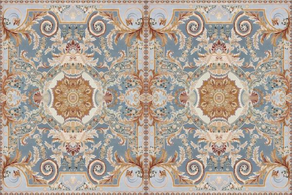 Dit verfijnde patroon ademt klassieke grandeur dankzij de symmetrische opbouw en overvloed aan sierlijke ornamenten. Centraal staan ronde medaillons met florale details, omringd door elegante krullen, acanthusbladeren en subtiele bloemmotieven. De zachtblauwe achtergrond vormt een frisse basis, terwijl warme tinten zoals goud, terracotta, crème en zachtgroen zorgen voor diepte en balans. Het samenspel van fijne lijnen en rijke decoratie geeft het geheel een statige, bijna paleisachtige uitstraling.
