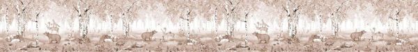 Een sfeervol boslandschap in warme sepia-tinten, met beren, herten, dassen en konijntjes tussen slanke berken en een dichte bladerkroon. Tijdloos, zacht en natuurlijk.