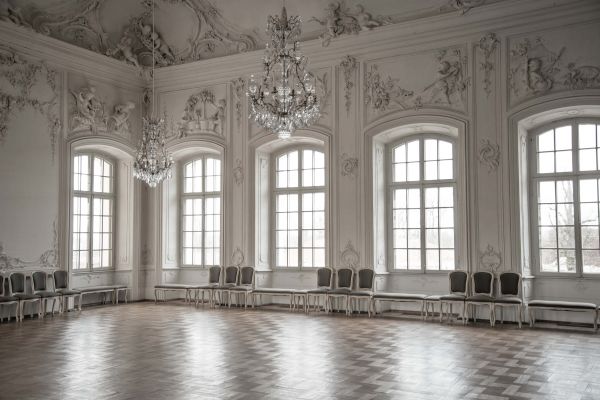 Een nette open ruimte met muurschilderingen, kroonluchters en grote ramen.