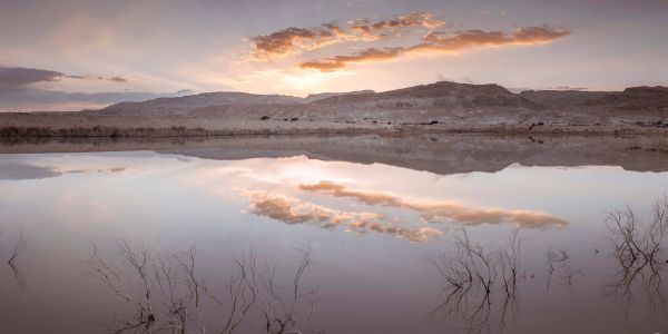Bergen bij de Dode Zee tijdens de zonsondergang. Achter de bergen is de zon net onder gegaan.