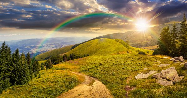 Bergen bij een mooie zonsondergang met een regenboog. Met dit fotobehang in huis is het net alsof je zo dit landschap in kan lopen.