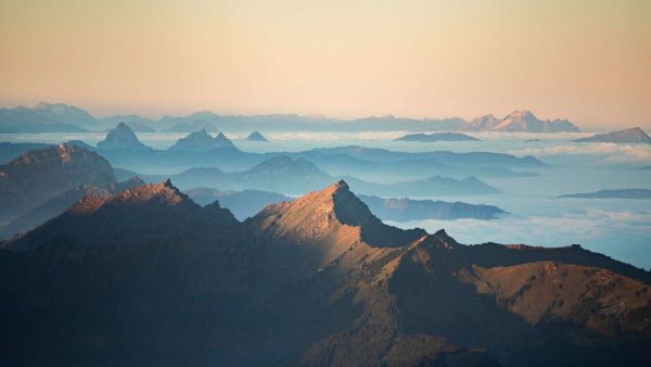 Een helder verlichte bergkam steekt af tegen een golvend landschap van nevel en schaduw. De zachte pasteltinten van de ochtendhemel en de gelaagde berglijnen zorgen voor een rustig en dromerig panorama vol diepte en sfeer.