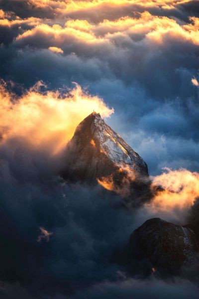 De structuur van de rots, lichtjes bedekt met sneeuw, benadrukt de ruwe schoonheid van de natuur. De gloed van de zon lijkt als een kroon op de bergtop te liggen, wat het geheel een bijna spirituele uitstraling geeft. De dichte wolkenmassa rondom suggereert hoogte, eenzaamheid en vrijheid, en creëert een intieme sfeer ondanks de grootsheid van het landschap.