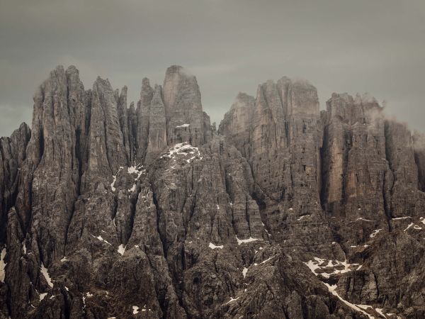 Bewolkte bergtoppen in het noorden van Italië, de Dolomieten. Op de bergen ligt een beetje sneeuw.