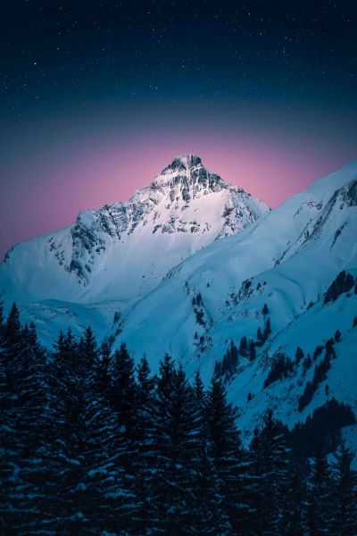 Dit beeld straalt stilte, kou en schoonheid uit in zijn puurste vorm. Centraal in het beeld staat een indrukwekkende bergtop, volledig bedekt met glinsterende sneeuw. De zon is net onder, wat zorgt voor een roze gloed aan de horizon die subtiel overgaat in een diepblauwe nachtelijke hemel, bezaaid met sterren. De voorgrond wordt gevormd door een dicht dennenbos, waarvan de donkere silhouetten sterk contrasteren met de heldere besneeuwde hellingen.