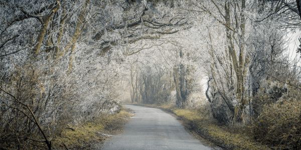 Bevroren weg door bos tijdens een winterse dag. Met dit fotobehang in huis is het net alsof je de weg op kan lopen.