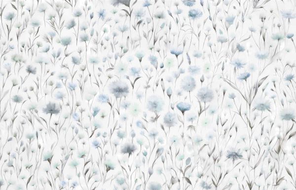 Een verfijnd en luchtig bloemenpatroon met tere wilde bloemen in zachte blauw- en grijsgroene tinten. De subtiele aquareltechniek en delicate details geven het ontwerp een serene en dromerige uitstraling, perfect voor een rustgevende en elegante sfeer.