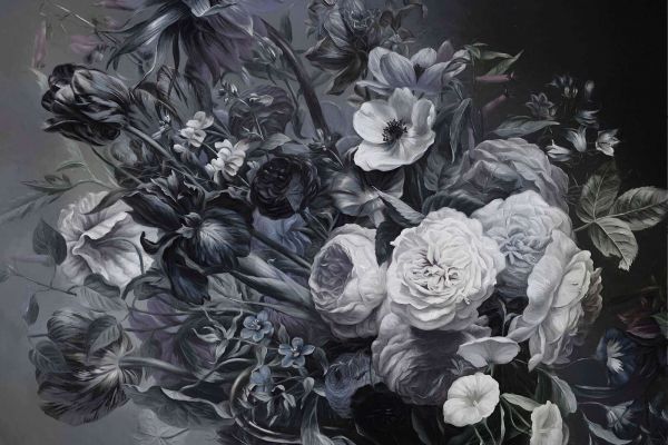 Dit indrukwekkende ontwerp vangt de sfeer van een koninklijk bloemenschilderij met een verfijnd palet van nachtblauw, grijs en crèmetinten. De donkere tulpen en anemonen contrasteren prachtig met de zachte witte rozen, waardoor een diep en dramatisch effect ontstaat. De subtiele penseelstreken en sfeervolle schaduwpartijen geven het geheel een klassieke en mysterieuze uitstraling, perfect voor een interieur dat luxe en elegantie uitstraalt.