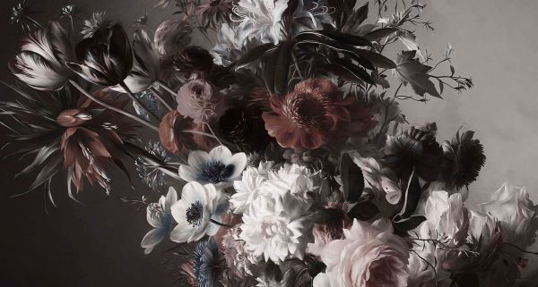 Dit indrukwekkende bloemmotief vangt de sfeer van een klassiek stilleven, met een rijke compositie van tulpen, rozen, anemonen en andere verfijnde bloesems. De diepe tinten van roestbruin, nachtblauw en ivoor worden geaccentueerd door een schaduwrijke achtergrond, waardoor de bloemen een bijna tastbare diepte krijgen. De gedempte kleuren en dramatische lichtval geven dit ontwerp een barokke, tijdloze uitstraling die zowel luxueus als mysterieus aanvoelt.