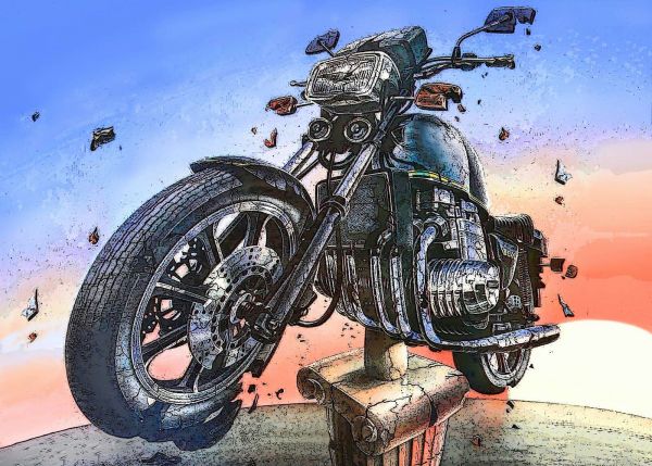 Dit opvallende ontwerp combineert de robuuste esthetiek van een klassieke motorfiets met een dynamisch en kunstzinnig perspectief. De motor staat op een verweerde sokkel, wat een gevoel van kracht en stabiliteit geeft, terwijl de lucht erachter wordt verlicht door zachte overgangen van blauw naar oranje, wat een sfeervol contrast biedt. Vliegende brokstukken rondom de motor voegen beweging en drama toe, waardoor het geheel een levendig en energiek karakter krijgt.