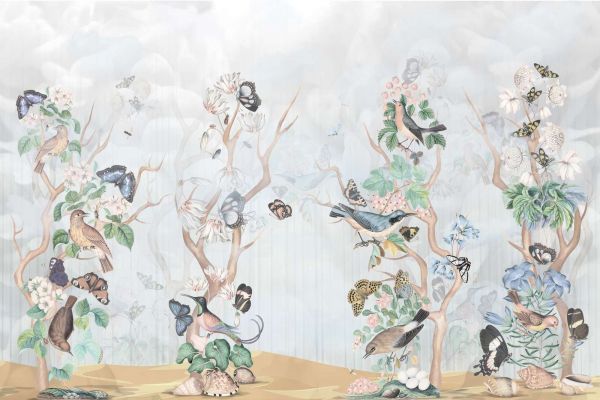 Een dromerig ontwerp met delicate vogels, vlinders en bloemen op fragiele takken. De zachte pastelkleuren en luchtige achtergrond geven het een sprookjesachtige sfeer, perfect voor een serene en natuurlijke ambiance.