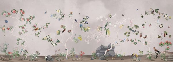 Dit ontwerp brengt een betoverende sfeer tot leven, waarin flora en fauna op meesterlijke wijze zijn samengebracht. Subtiele kleuren en fijne details vormen een harmonieus landschap dat de sereniteit van de natuur uitstraalt. Bloeiende bloemen, elegant vliegende vogels en lieflijke vlinders creëren een levendig tafereel dat zowel dynamiek als rust uitstraalt. De zachte pasteltinten en organische vormen passen perfect in diverse interieurstijlen, van een moderne Scandinavische setting tot een klassieke of romantische sfeer.