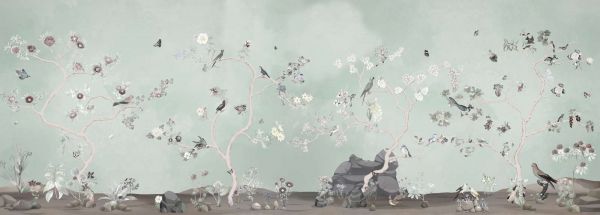 Dit ontwerp brengt een betoverende sfeer tot leven, waarin flora en fauna op meesterlijke wijze zijn samengebracht. Subtiele kleuren en fijne details vormen een harmonieus landschap dat de sereniteit van de natuur uitstraalt. Bloeiende bloemen, elegant vliegende vogels en lieflijke vlinders creëren een levendig tafereel dat zowel dynamiek als rust uitstraalt. De zachte pasteltinten en organische vormen passen perfect in diverse interieurstijlen, van een moderne Scandinavische setting tot een klassieke of romantische sfeer.