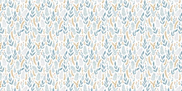 Blauw behang met een patroon van verschillende bladeren. Deze bladeren staan op een witte achtergrond.