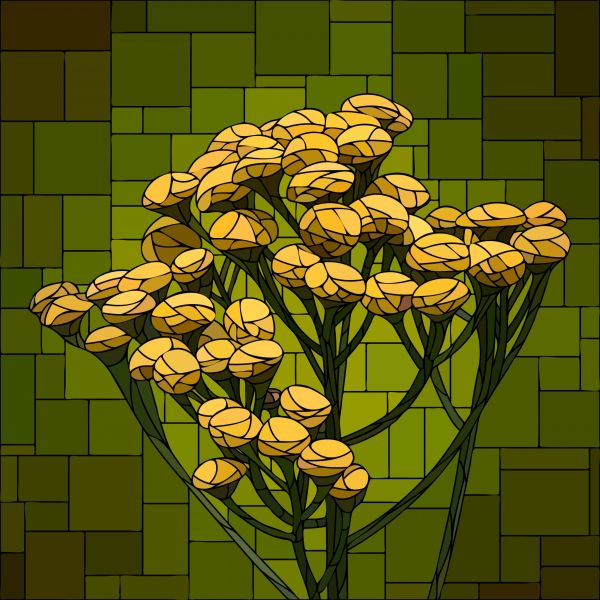 Gele bloemen in de bloei op fotobehang. De foto heeft een glas-in-loodraam effect hierdoor geeft dit fotobehang de kamer nog meer sfeer.