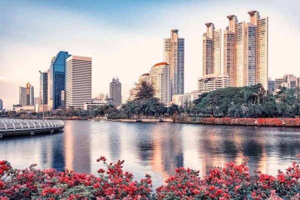 Een bruisende skyline bij zacht avondlicht, weerspiegeld in een rustige waterplas. De felrode bloemen en het weelderige groen vormen een warm contrast met de strakke lijnen van de hoge gebouwen.