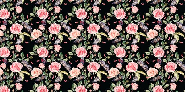 Fotobehang met verschillende bloemen en vlinders gemaakt van waterverf op een zwarte achtergrond. Een vrolijk aquarel.