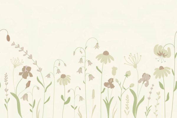 Hoog bloemenveld met verschillende bloemen. Kleur: Beige met oud roze