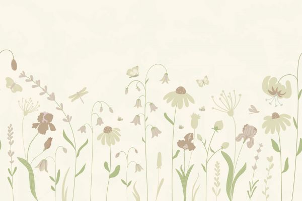 Hoog bloemenveld met verschillende bloemen en diverse insecten zoals vlinders en bijen. Kleur: Beige met oud roze