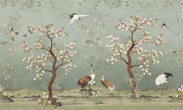 Een harmonieus tafereel vol natuurlijke elegantie ontvouwt zich in dit rijke ontwerp, waarin sierlijke bloesembomen en gracieuze kraanvogels de hoofdrol spelen. De achtergrond is uitgevoerd in een zachte jadegroene tint met een subtiele textuur die de sfeer van een geschilderde zijden wand oproept. De bloesems variëren van roomwit tot poederroze en oudroze, terwijl de takken zich sierlijk buigen boven een rustgevend landschap. Tussen de bloesems fladderen zangvogels en vlinders, wat het geheel een levendig maar uitgebalanceerd karakter geeft.