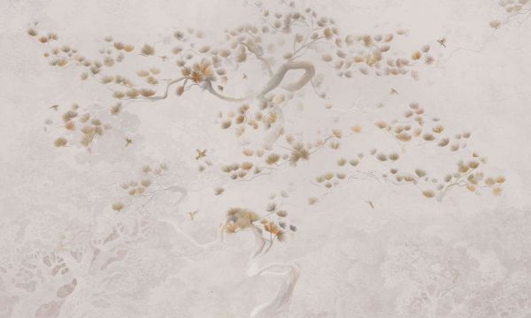 Deze minimalistische en elegante illustratie straalt rust en verfijning uit. Zwevende takken met sierlijke, bijna transparante bladeren waaieren uit over een zachte, beige achtergrond. De delicate penseelstreken en het gebruik van subtiele kleurgradaties in warme bruintinten, goudgeel en zachtgroen geven het ontwerp een bijna meditatieve uitstraling. Kleine vogels fladderen stilletjes tussen de bladeren, alsof ze deel uitmaken van een verstilde Japanse prent of een oude muurschildering.