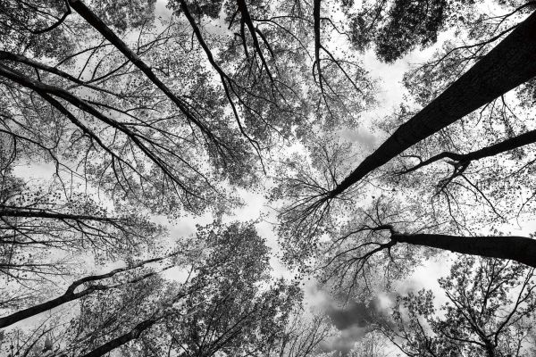 Een krachtig lijnenspel van hoge bomen die zich vanuit het midden uitstrekken naar de hemel, weergegeven in contrastrijk zwart-wit. Een visueel diepte-effect dat rust en bewondering oproept.