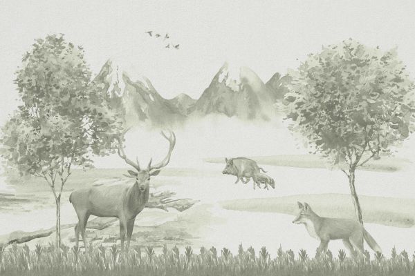 Fotobehang - Bos met dieren in groen