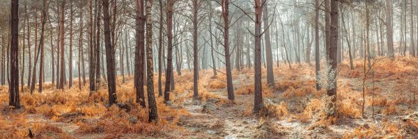 Bos tijdens de herfst. De bladeren in het bos zijn al mooi oranje gekleurd.