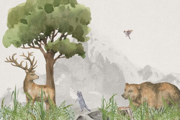 Fotobehang - Bosdieren bij een berg