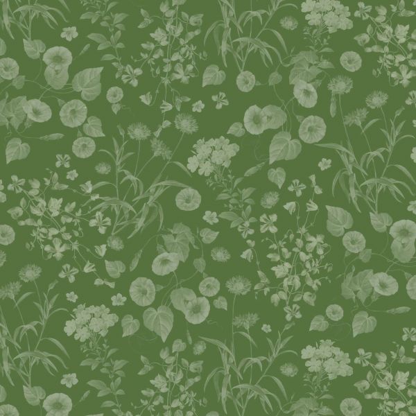 Een verfijnd patroon met delicate bloemen en bladeren in ton-sur-ton groentinten tegen een diepe smaragdgroene achtergrond. Het ontwerp straalt natuurlijke harmonie en rust uit.